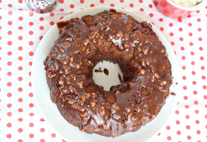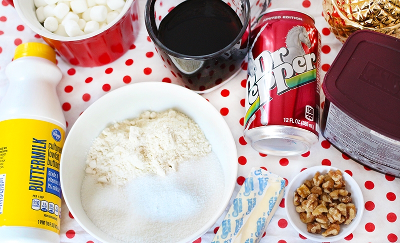 - Sift flour and sugar together. Add marshmallows to the flour and sugar mixture. Set aside. Put butter, cocoa, and Dr Pepper in a saucepan. Heat until butter melts. Pour over sugar and flour mixture. Gently stir together. In a separate bowl, mix eggs, buttermilk, and baking soda. Add to first mixture. Bake 45 mins at 300 degrees in a bundt pan. Remove from the oven and let cool completely in pan. (If you don’t cool it completely, it will crumble). Cover with icing.