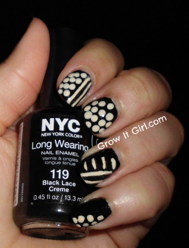 The base color is Black Lace Creme by NYC. The bottle says long-wearing but I was skeptical. Let me tell you, this polish surprised the heck out of me. It survived not only a wash day but for me texlaxing, shampooing, and the entire process. I had a couple of small chips but nothing major and not at all what I expected to see. I thought for sure the relaxer would’ve taken off most of the color. I am now a fan!